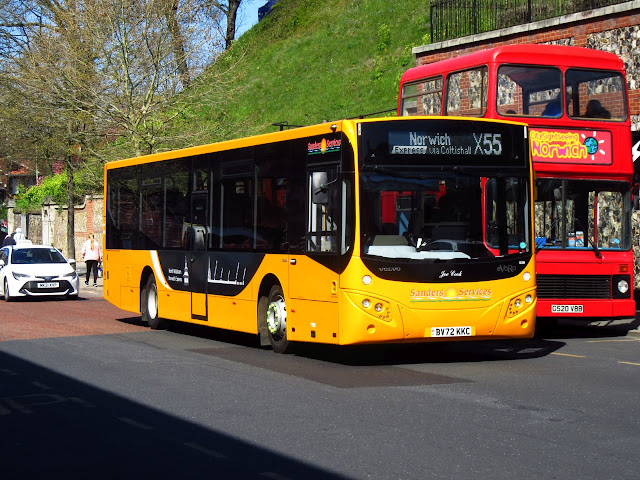 Picture below is one of Sanders Coaches Volvo/Evora single deckers numbered 531 on service X55 from North Walsham to Norwich pictured in April 2023 (Picture courtesy of East Norfolk Bus Blog)